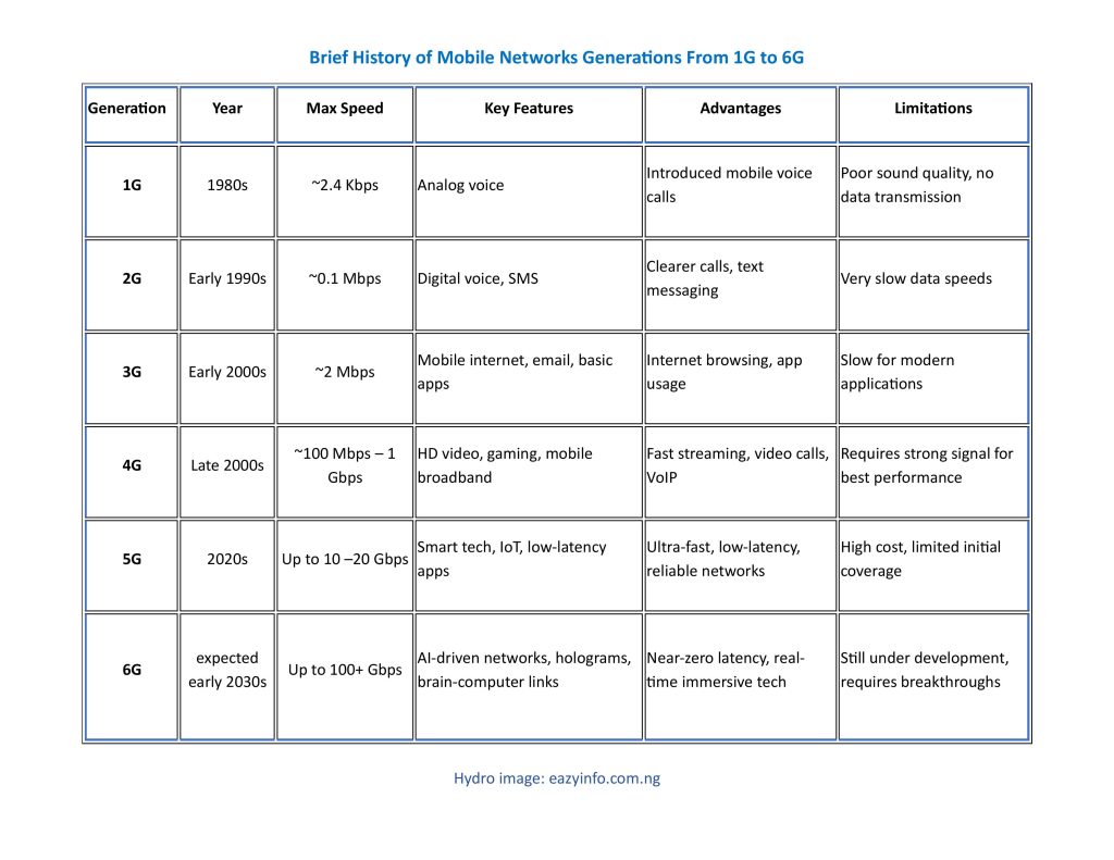 | 6G | expected early 2030s | Up to 100+ Gbps | AI-driven networks, holograms, brain-computer links | Near-zero latency, real-time immersive tech | Still under development, requires breakthroughs |