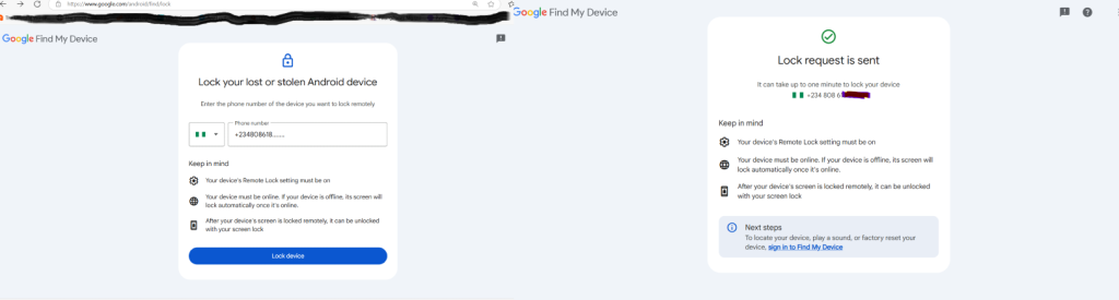 Once “Find My Device” is enabled, you will now be able to remotely lock your smartphone using another device/phone or computer connected to the internet: