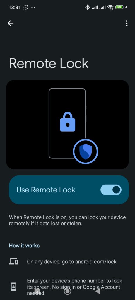 Some Android versions or device manufacturers might have additional or specific settings for “Remote Lock” within the “Theft protection” menu and under Google settings. Try the following: