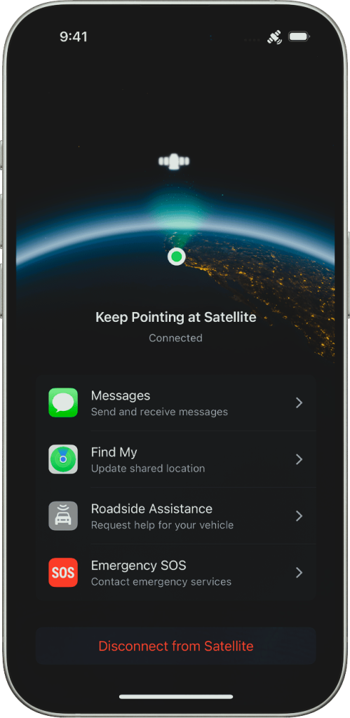 If you have cellular or Wi-Fi coverage, the Satellite option in Settings won’t appear and the Satellite option in Control Center opens the Satellite Connection Demo.